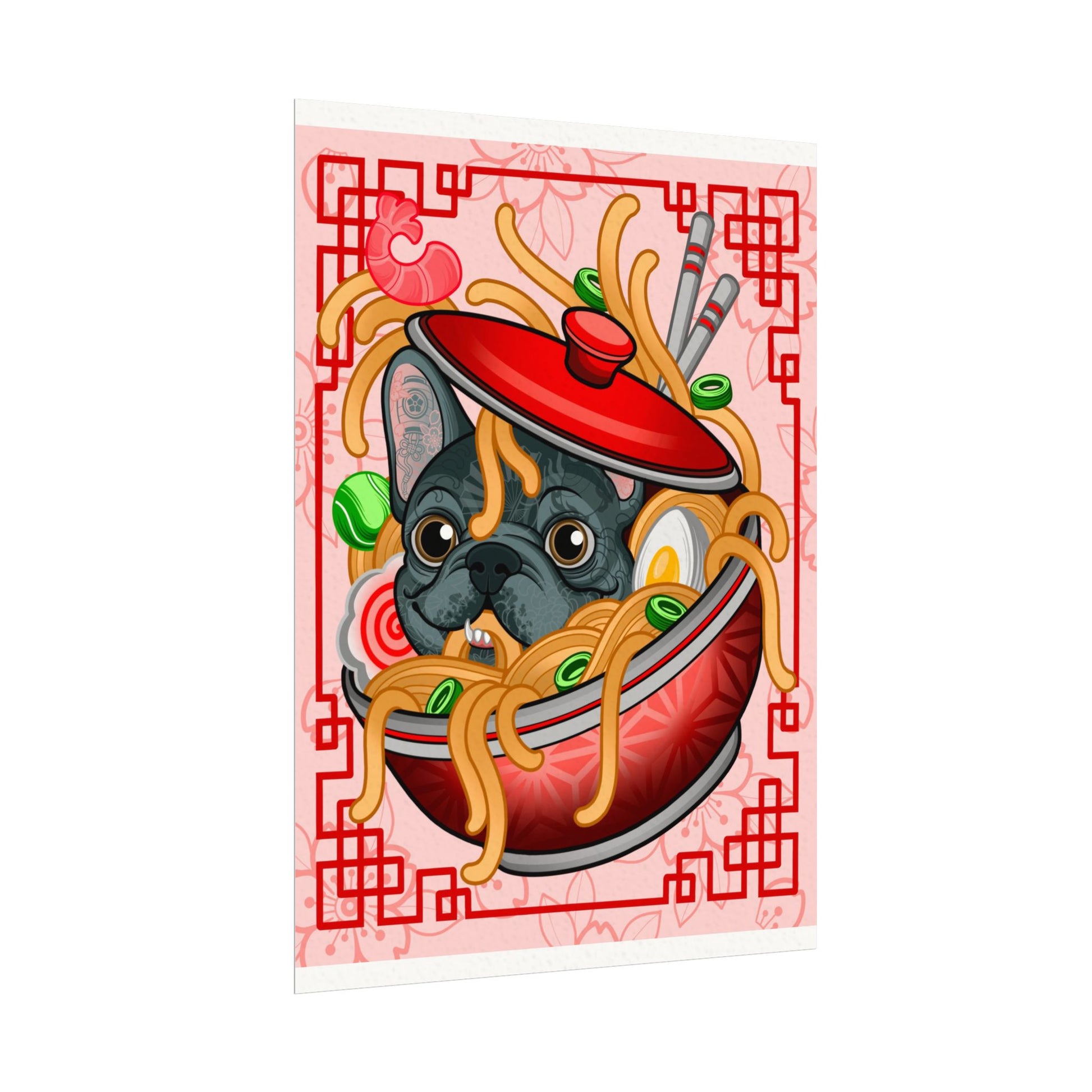 This textured watercolor matte poster features a unique art print of Reaper the French bulldog with Japanese tattoos in a bowl of ramen creating gremlin chaos. The vibrant colors and premium textured matte finish give off a mysterious and artistic vibe, perfect for art enthusiasts and dog lovers. Ideal for decorating living spaces or offices, this poster is relevant for Halloween, art lovers, and dog owners.